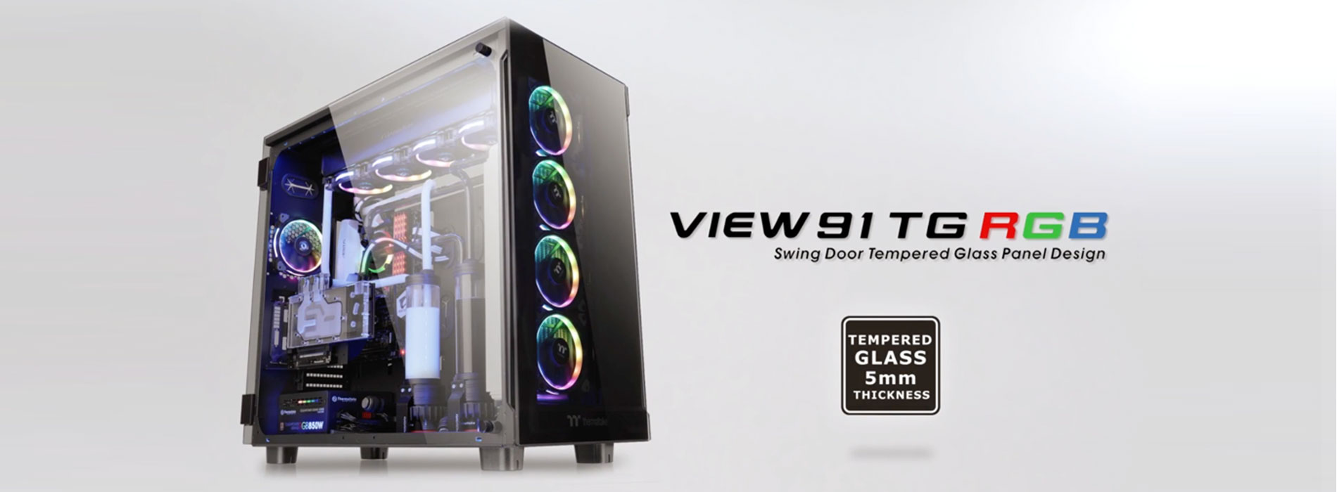 La edición View 91 RGB cuenta con tres paneles de vidrio templado de 5 mm de grosor para mostrar su hardware interno y la iluminación RGB. Tiene cuatro ventiladores Riing Plus LED RGB de 140 mm incorporados, y ofrecen 16,8 millones de colores para completar el ciclo y cuentan con 12 LED controlables que están controlados digitalmente por PWM a través del software Riing Plus RGB.