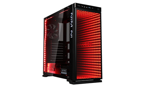Gabinete Media Torre con vidrio templado certificado para ROG y un efecto infinito. El panel frontal de 805 Infinity posee un efecto de iluminación de LED que usa tiras de LED y un espejo. El reflejo es una ilusión que muestra filas de luces de LED interminables perdiéndose en la oscuridad; este efecto se conoce como el "Espejo